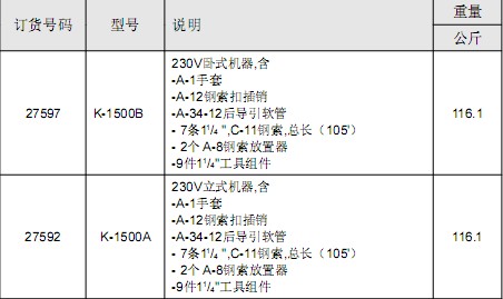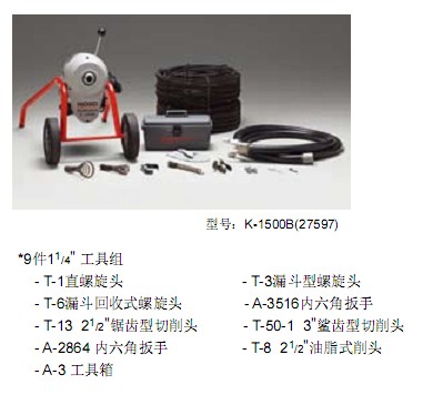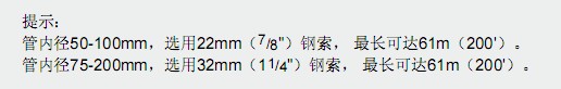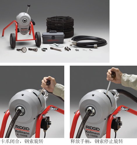 疏通能力:管内径50-200mm(2"-8")主排水管道, 最大长度可达61m(200′) 用于清理各种主排水管道的最佳工具。一个人可以轻易操作机器来清除最严重的堵塞问题,无论是室内还是户外。高速的清洁效率使得工作完成得更快、更好。 特性与技术参数: 独特、易于使用的钢索离合器可以瞬间传递扭矩使钢索旋转,使操作者非常容易操控。 -压下手柄,钢索转速可达710RPM -释放手柄,钢索立即停止转动,不会过度旋转以至于发生 缠绕而损坏钢索。 • 带有轮子,可以迅速到达工作场所,安装和清洁管道都很快。 • 较低的B型卧式机架适合于低矮的空间操作,也容易从卡车上搬上/搬下。A型立式机架适合于在运输过程中存放钢索,室内应用的理想工具。 • 标准配置:单根长4.6m(15′ )直径32mm(11/4" )的分节式钢索清理管径为3"-6"(75mm-200mm)的管道,长度可达200英尺(61m)。 • 更换卡爪,即可使用单根长4.6m(15英尺)、直径22m(7/8")的分节式钢索来清理管径为2"-4"(50mm-100mm)的管道,长度可达175英尺(53m)。 • 配置230V,1500W电机 • 标配工作手套和操作手册