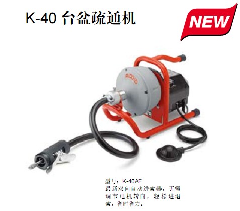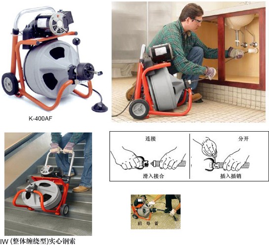 疏通能力:管内径30-100mm(11/4"-4"),最大长度可达30m(100′) 新款K-400疏通机具有操作简便的独特功能,令管道疏通变得容易和轻松,现代结实的轮廓设计,使得K-400非常适合于管道清理及疏通工作 。它是管道实验室和研究单位的维修保养部门,以及物业管理公司的最佳帮手。典型应用:厨房下水道,卫生间主下水,屋顶通风口等。 特性与技术参数: ·最新推车集成设计,高强度橡胶轮,可轻松进行在不平地面或楼梯。 ·伸缩手柄:高位于柄便于移动机器,低位手柄可使操作机器稳定性增强并结省空间。 ·新型扭矩保护装置,当切削头嵌入堵塞物超过扭矩极限时,该装置能使鼓轮停转以提醒操作者注意避免钢索纠缠在一起。 ·新颖的鼓轮设计采用坚固的、防腐蚀的PE塑料制成。因此鼓轮具有防锈抗撞击的功能独特的三角形设计,能及时观察钢索的情况,支架与地面成90°能有效的控制钢索。 ·全新整体缠绕实心钢索采用坚韧的整体密绕的10mm(3/8")和12mm(1/2")的实心钢索具有防止纽缠的功能,其长度15m(50′)和23m(75′),能与各种切削工具头快速连接。 ·自动进给功能:自动进给装置能使钢索自动进出管道,从而减少手工操作此装置,操作简便只需将手柄反响操作即可,且可根据客户需求只有选配。 ·气动脚踏开关 ·标配工作手套操作手册和演示视频