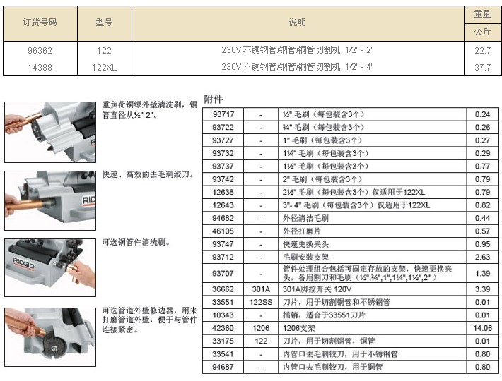 | 122/122XL能迅速地对不锈钢管/钢管/铜管进行切割、清洁、铰孔和去除毛刺,是专业的管道加工和预处理的机器。手提式设计能够非常便利地携带到工作地点。坚固的铸铝机身和强大的感应电机确保了机器的长久寿命。 122型工作范围 不锈钢管/铜管/钢管:12mm-60mm(½"-2") 122XL型工作范围 不锈钢管/钢管/铜管:12mm-120mm(½"-4") 特性与技术参数: •230V,360W感应电机驱动辊子,辊子转速为450RPM(122),300RMP(122XL)。 •坚固的清洁毛刷能够容易的快速清洁管子。 •绞刀能够非常容易地去除毛刺。 •切割手柄能够调节机器以适应不同尺寸的管子。 •导向辊子确保切割整齐。 •手柄设计方便把机器运到工作地点。 •具有一个刻度增量为½"的尺,能够迅速方便的进行测量。 •管件处理组合包括毛刷(6个)、储存架和夹头。 |