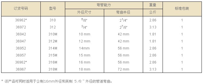 | •设计可将铜管最大弯曲至180°。 •平行偏置带塑胶套的手柄和90度起始角,以及特殊的塑胶导向滑块,可以减少弯曲阻力。 •300系列弯管器可平滑弯曲K&L型软铜管。 |