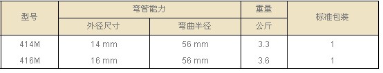 ·适用于管外径14/16mm,壁厚从1-2mm的不锈钢管,钢管、铁管、铜管等,弯曲半径56mm。 |