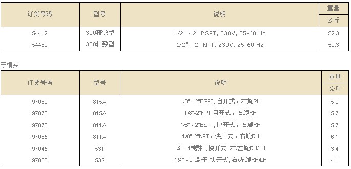 | 套丝能力 ·管子:1/8"-2"(3mm-50mm) ·螺杆:螺杆:1/4"-2"(6mm-50mm) 特性与技术参数 ·能适应重负荷工作条件的要求。 ·重量轻,轻巧设计。 ·便于运输,架起迅速。 ·自动润滑,可调节油量。 ·可以套丝和滚沟。 ·工作时噪音小。 ·电机1700W,230V,25-60Hz。 ·电机控制:正转/停止/反转。 ·转速:38RPM。 ·卡爪:锤击式夹紧卡爪设计和可更换的3颚钳口。 ·润滑系统:头部润滑,带一体化储油池,自动起动注油持续润滑,内齿轮轴承油泵。 ·360型割刀,自动定心,全浮式。 ·344型绞刀,1/4"-2"(3mm-50mm).5-刃切削,仅右旋设计。 |
