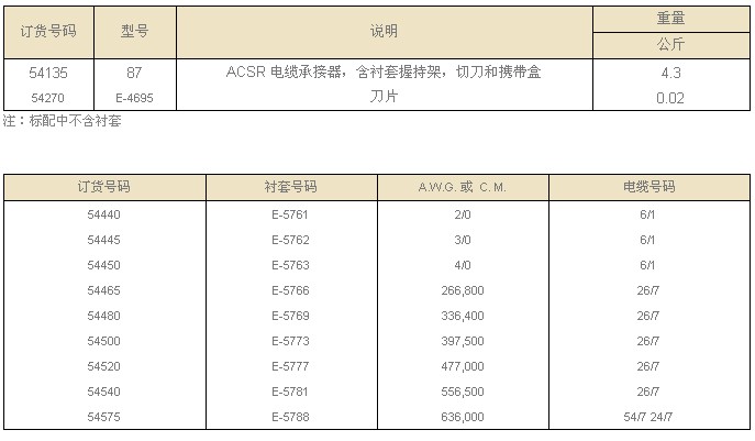 | RIDGID 87 ACSR型电缆承接器可以快速、精确的对电缆接头进行准备: ·整修85尺码的ACSR电缆,从8 AWG到1780000C.M.。 ·轴套可用于9种常用电缆,尺寸从1/0AWG到1780000C.M.。 ·操作方法和薄管割刀类似。 ·轴套握持架、割刀和包装盒为一组,一道出售。 ·包装盒内可以存放11个轴套,第12个轴套已装在握持架上。 |