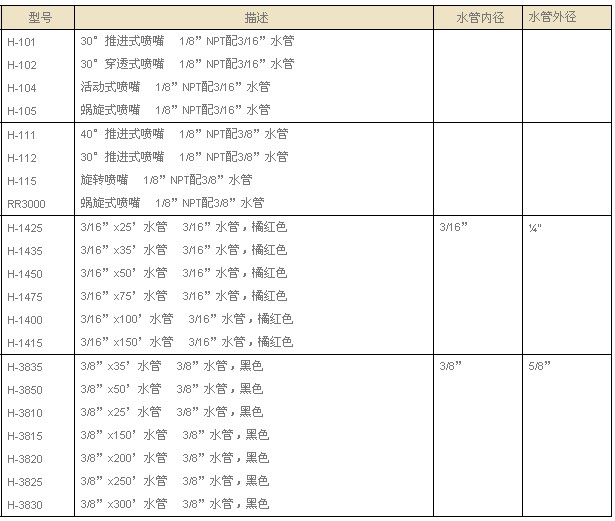 特性与技术参数 强力:高达3000psi的工作水压,配合5.5GPM的流量,使其能快速,有效的清洗管道。 轻质水管:水管由尼龙编织物制成,减轻重量的同时保证了弹性,但不减小刚度,容易推入较长管道进行工作。 设备齐全:利用KJ-3100可移动钢索水管卷盘,无需配备更昂贵的手提式水管卷盘,脚踏开关的配备使机器可适用于室内外各种场合。 方便:将水管卷盘完全移除可方便的搬运设备。将卷盘向前滚动即可方便的检视油缸及过滤器。 机动性:在所有同级别的3000psi清洗机中,KJ-3100是市场上机动性最好的设备之一。23”宽的两轮推车使其能顺利通过标准尺寸的门及陡弯。 脉冲水流:启动KJ-3100的脉冲模式,水管震动能使其轻易通过各种弯角和存水弯。 质量及可靠性:防腐,铜铸造的三缸泵中配有齿轮减速装置,允许泵在较低速度下运转。减少了各种配件,软管及配件的数量,最大程度上防止泄露及停运,保证长时间工作。 快速启动:16HP的反冲式汽油引擎能快速启动。配置:ON/OFF开关,油门,风门及火花塞。