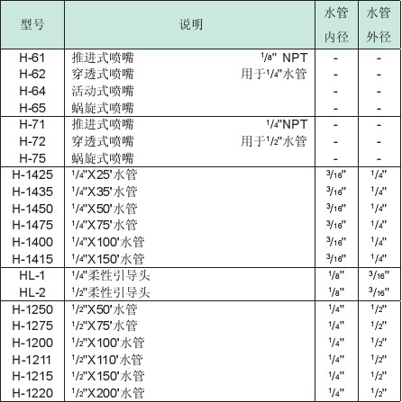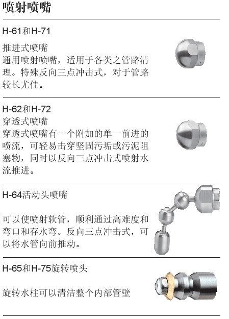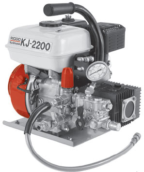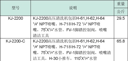 KJ-2200 清洗能力:管内径30-150mm,最大长度可达61m(200′) 最大水压:150公斤(Bar) 2200PSI 水流量:10升/分钟(2.4GPM) 高压清洗机能清除污泥、肥皂污物和油脂等阻塞物。回撤水管时,它能强力冲刷清洗管子中因高压水冲洗而产生的碎片,使水管恢复最大容量,保证畅通。 特性与技术参数: ·使用简单:利用喷射口的冲力来推动,自进式水管,能方便的让水管进入管道进行清洗。 ·脉冲水流:启动KJ-2200脉冲运动,使其能顺利通过弯处和存水弯。 ·轻便H-30小推车能轻松地将高压清洗机和水管推到那些难以接近的部位,适合室内、郊区等工作场所。 ·方便:标准附件包括FV-1脚踏式控制开关。它能保证远距离或室内操作简易安全。机器摆在屋外时,你可以在管道边控制。 ·质量和可靠性:防腐、铸造,铜主件的三重泵,减少配件、软管和防止泄漏的部件。 ·多功能:任意功率的清洗箱能洗钢索、工具和其它重油设备。 ·5.5HP,四冲程引擎,马力强劲。